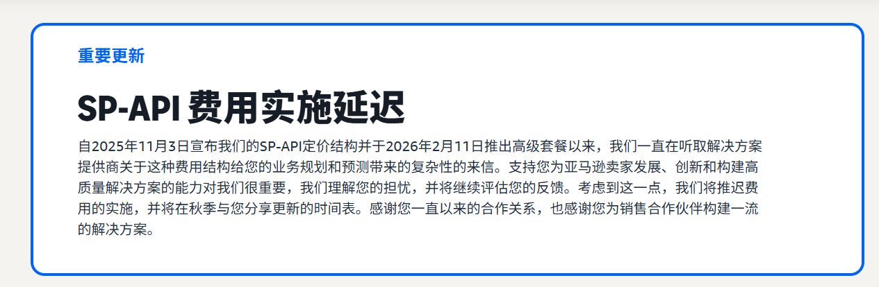 自2025年11月3日宣布我们的SP-API定价结构并于2026年2月11日推出高级套餐以来,我们一直在听取解决方案提供商关于这种费用结构给您的业务规划和预测带来的复杂性的来信。支持您为亚马逊卖家发展、创新和构建高质量解决方案的能力对我们很重要,我们理解您的担忧,并将继续评估您的反馈。考虑到这一点,我们将推迟费用的实施,并将在秋季与您分享更新的时间表。感谢您一直以来的合作关系,也感谢您为销售合作伙伴构建一流的解决方案。