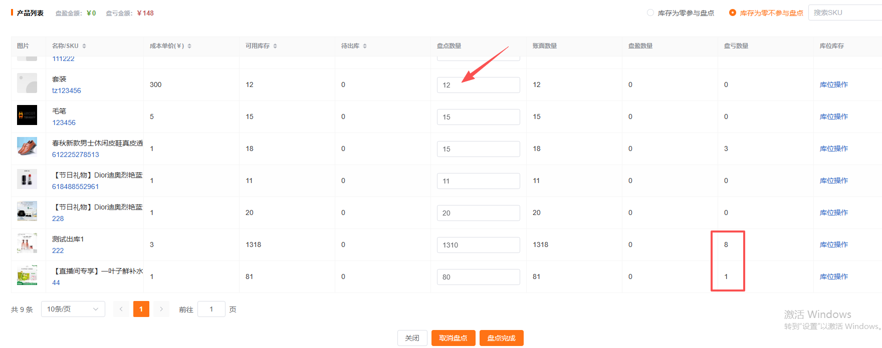 2.4填写盘点数量,系统会自动计算盘盈和盘亏的数量