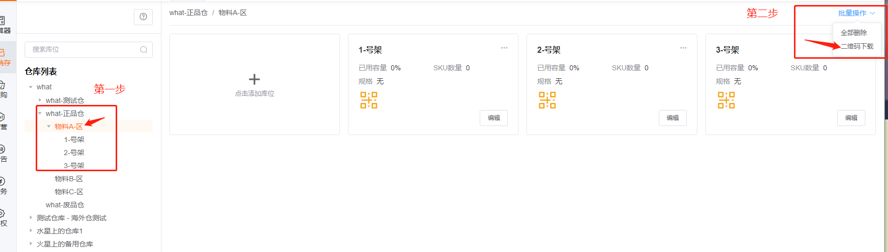 需要打印 物料A区中,1~3号货架的二维码,则选中【物料A区】,在右上角点击【批量操作-二维码下载】即可