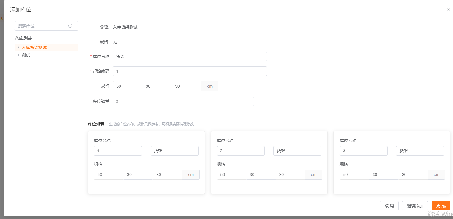 父级:必选,在选择的父级仓库或库位下添加该库位