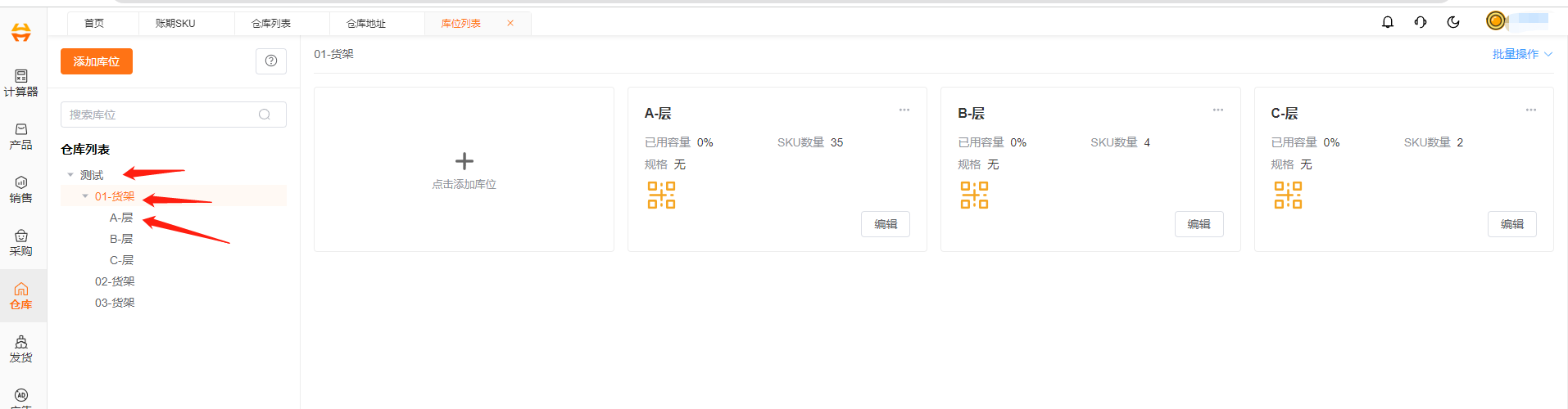 用于管理和组织仓库中的存储位置。通过树形结构和卡片视图,用户可以直观地查看、添加和编辑库位信息。