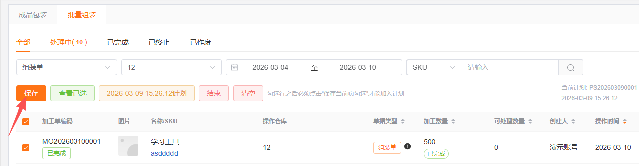 2.1选择仓库、日期范围、输入SKU或订单编号搜索需要包装的产品,然后点击“保存”加入计划