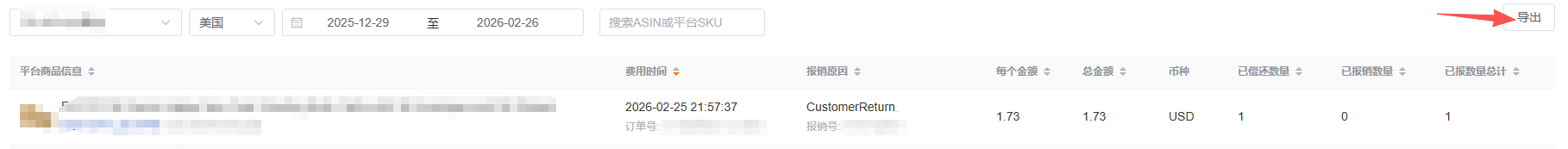 选择要查看的店铺、日期范围、搜索框中输入ASIN或平台SKU,系统自动加载并显示符合条件的赔偿费用记录