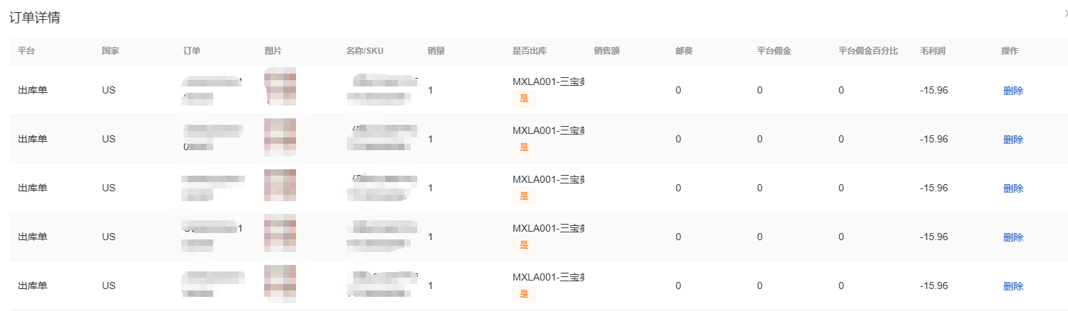 关于删除订单:点击【删除】后,系统将从当前视图中移除该订单记录。