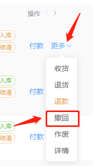 已审核通过且入库/付款数量均为0时,可操作【撤回】,将单据撤回为待审核状态进行信息编辑,重新进行审核。