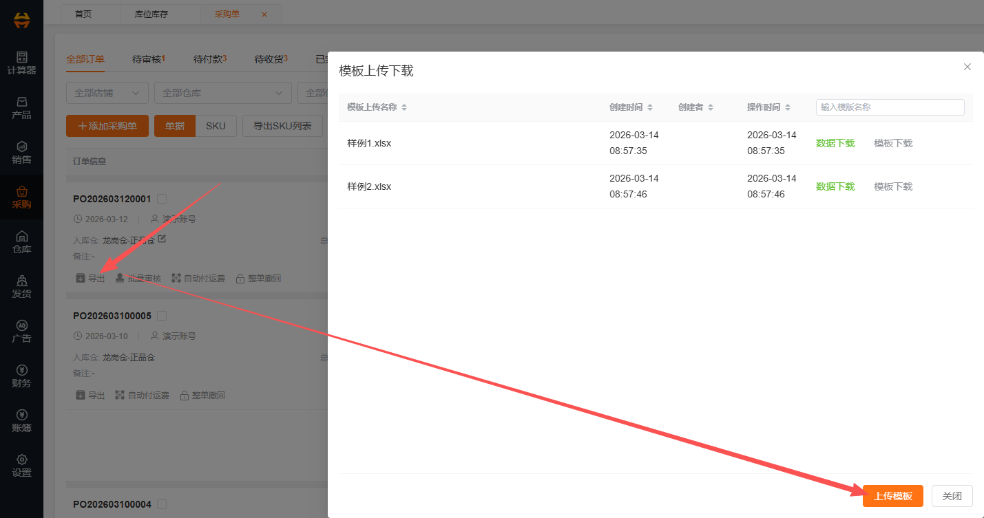 选择对应的采购单,点击“导出”,系统自动跳转到模版下载对话框