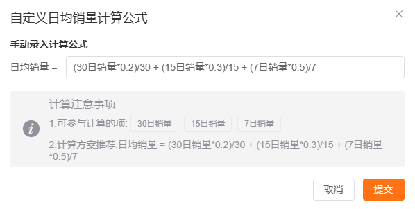 系统默认公式:近30日平均销量占比20%+近15日平均销量占比30%+近7日平均销量占比50%