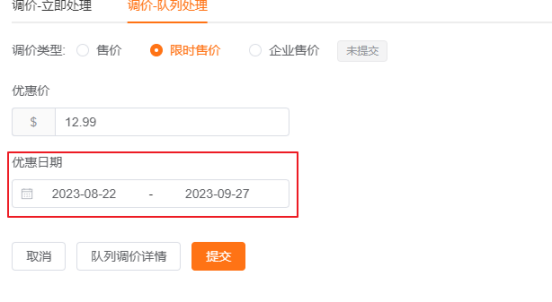 将在用户设定的时间范围内,将商品价格改至提交的价格,到期后恢复至原价