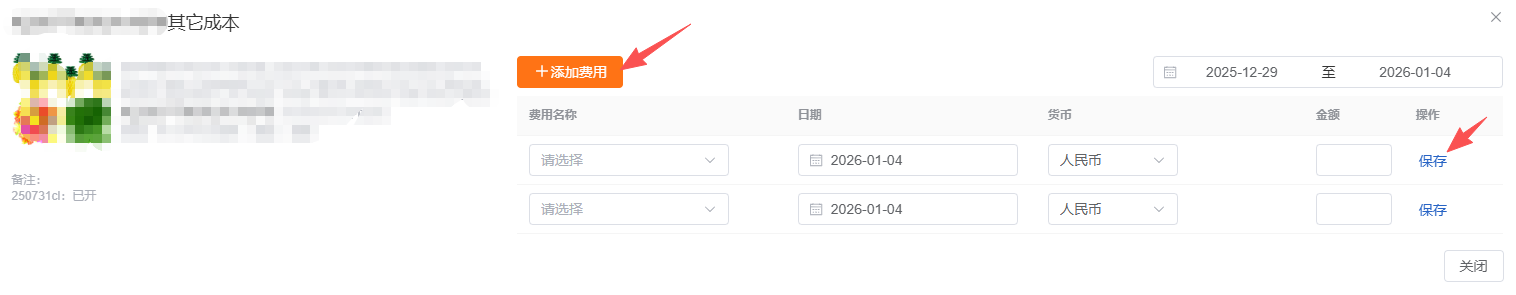 4.1.2. 添加费用成本:选择费用项、选择费用发生日期、选择币种、输入金额、保存