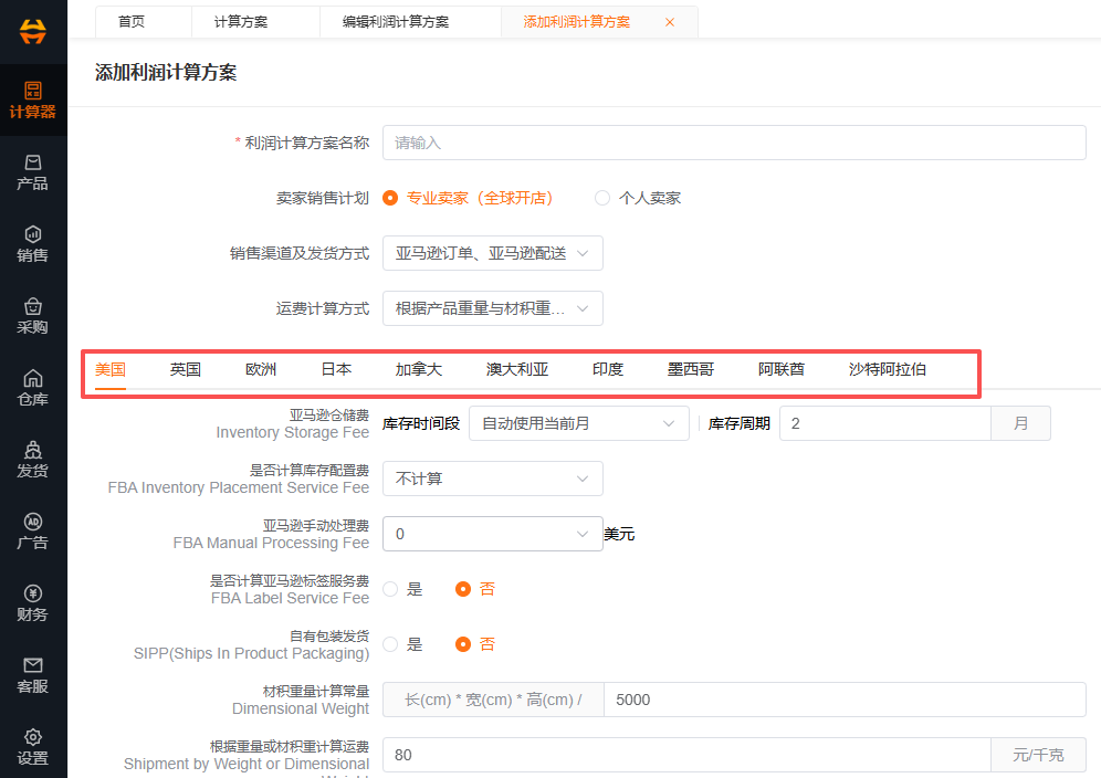 1.3.4.按站点分别设置成本参数(FBA费用、头程、税、固定营销成本等)