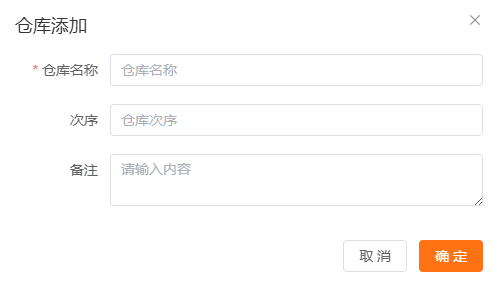 点击"添加"按钮,在弹窗中填写仓库信息:仓库名称(必填)、显示次序、备注信息