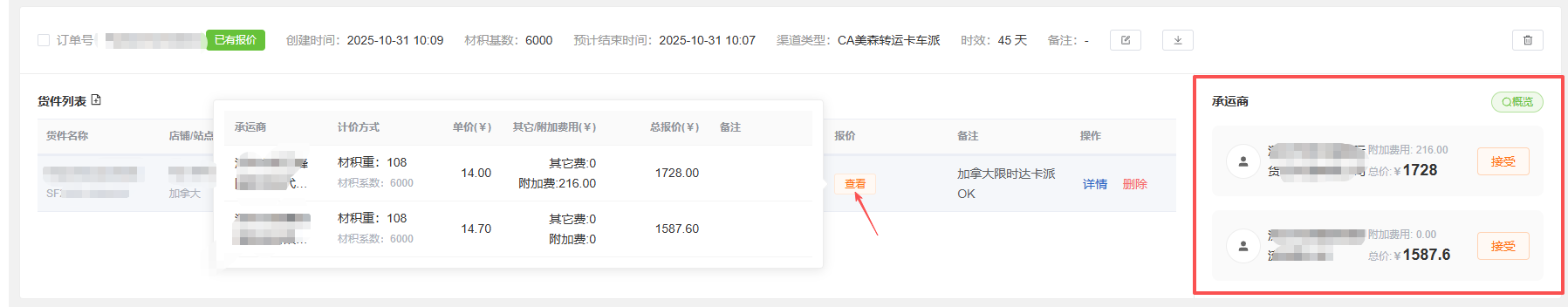 4.1查看报价详情:点击货件行的"查看"按钮或承运商区域的报价卡片