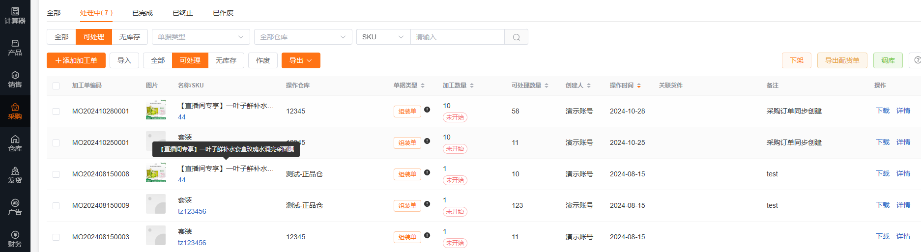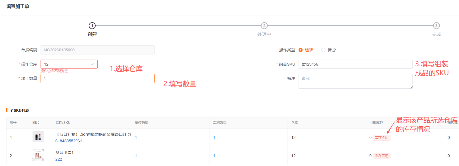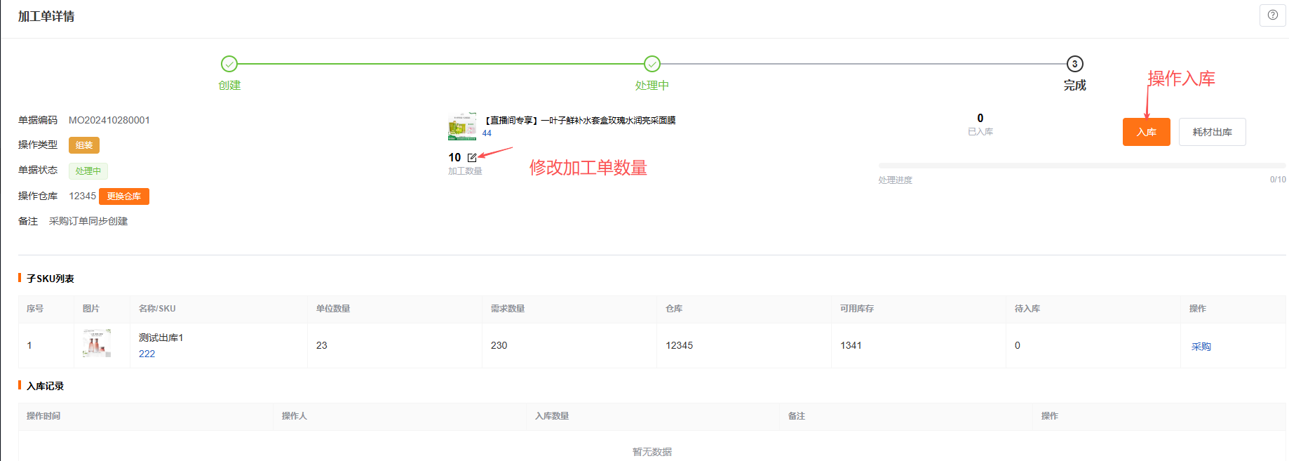 提交组装单后进入【处理中】状态,可直接进行入库操作