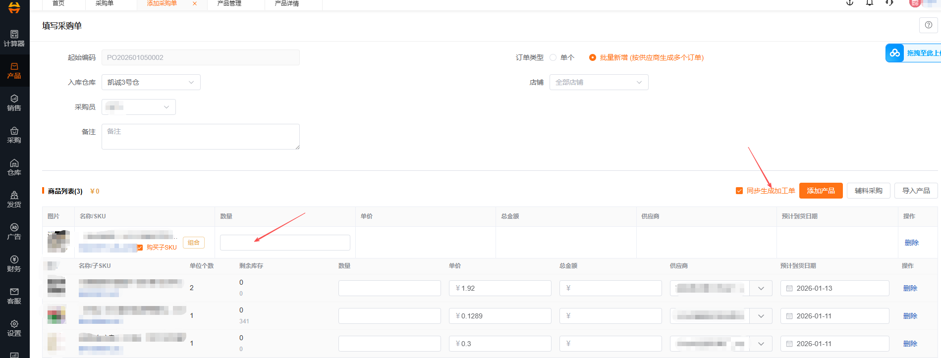 系统在创建采购单时,会默认勾选【同步生成加工单】选项。该选项代表,在用户添加组装成品进行采购、且采购子产品时,将会自动创建一个与采购单中所采购组装成品数量的加工单。