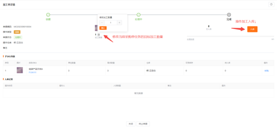 3.3.当入库数量 = 加工数量 时,当前加工单将自动转为【已完成】状态,入库数量不可大于处理数量