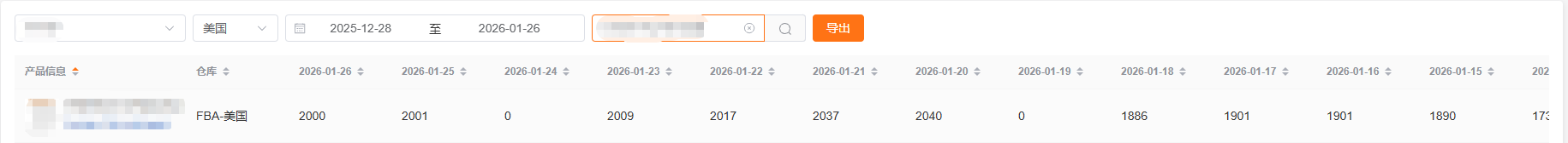选择店铺、站点、日期范围、输入SKU关键词,点击搜索按钮或按回车键,系统自动加载并展示符合条件的库存数据。