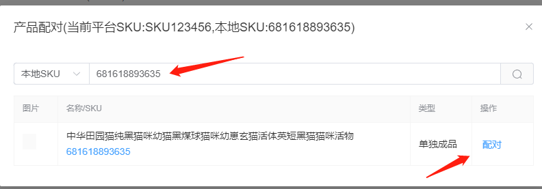 2、输入对应本地SKU,在结果产品列表中点击【配对】。