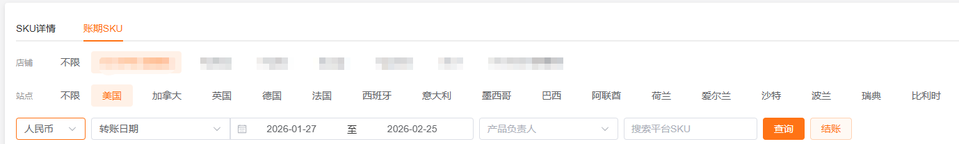 根据店铺、日期类型、日期范围、负责人等条件筛选账期SKU数据。