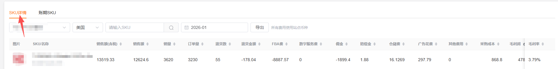 用于查看和分析各SKU在指定账期内的财务数据报表